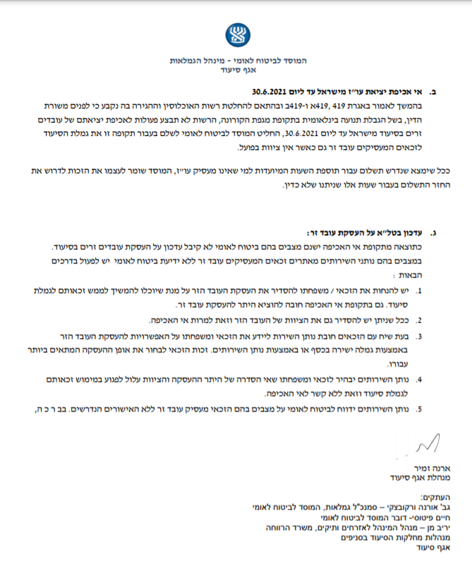 Работодатели теперь могут нанимать опекунов, даже тех, кто находится в Израиле более 13 лет, без необходимости регистрироваться в кадровом агентстве. Сиделки могут работать без ограничений до 30 июня 2021 года. Агентство социального обеспечения в Израиле будет выплачивать пособие по уходу, чтобы покрыть расходы на трудоустройство опекуна.