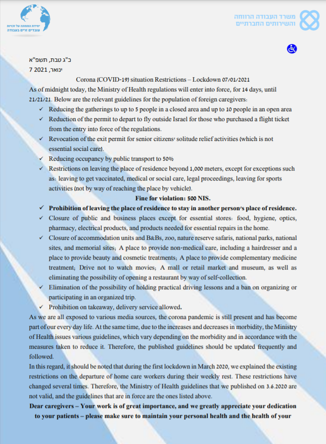 As Israel enters into another strict lockdown, please read the important guidelines/regulation for Foreign Caregivers in English and Hebrew. Read carefully below and do not forget to share this with your friends and fellow caregivers. Be safe everyone!